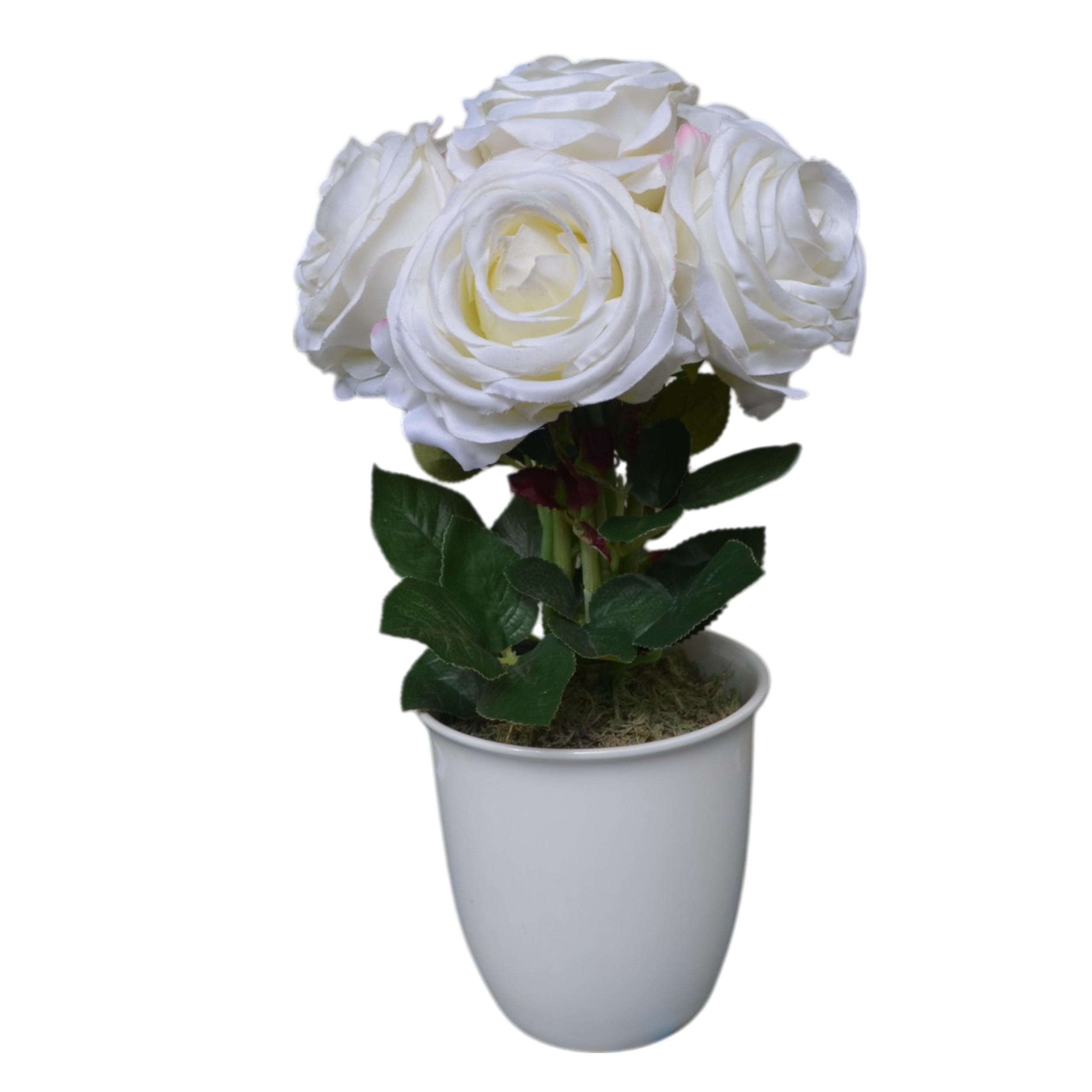 Vaso de porcelana branca com arranjo de rosas brancas premium, estilo bouquet amarrado