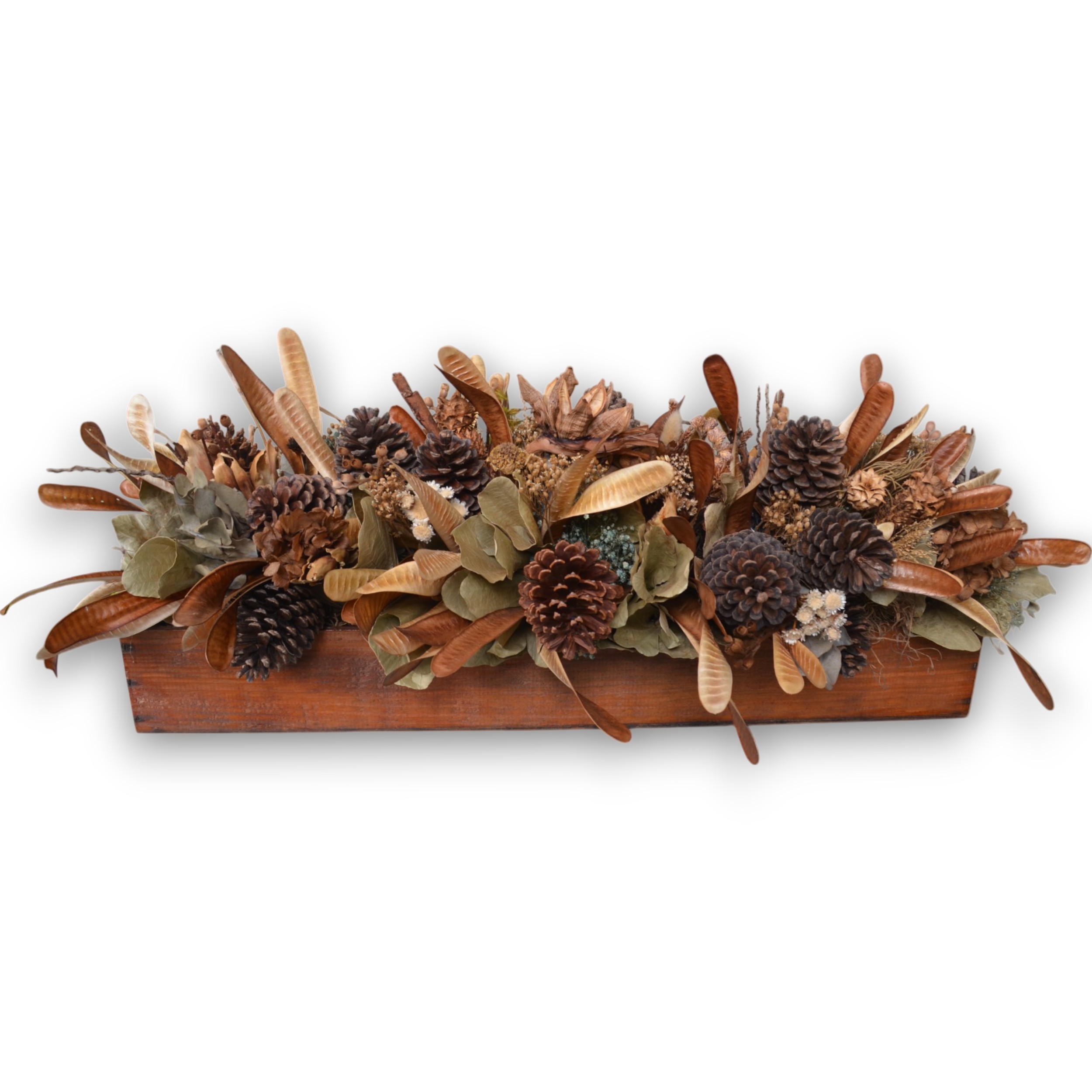 Arranjo feito com folhas e flores desidratadas, musgo e pinhas, em peça de madeira