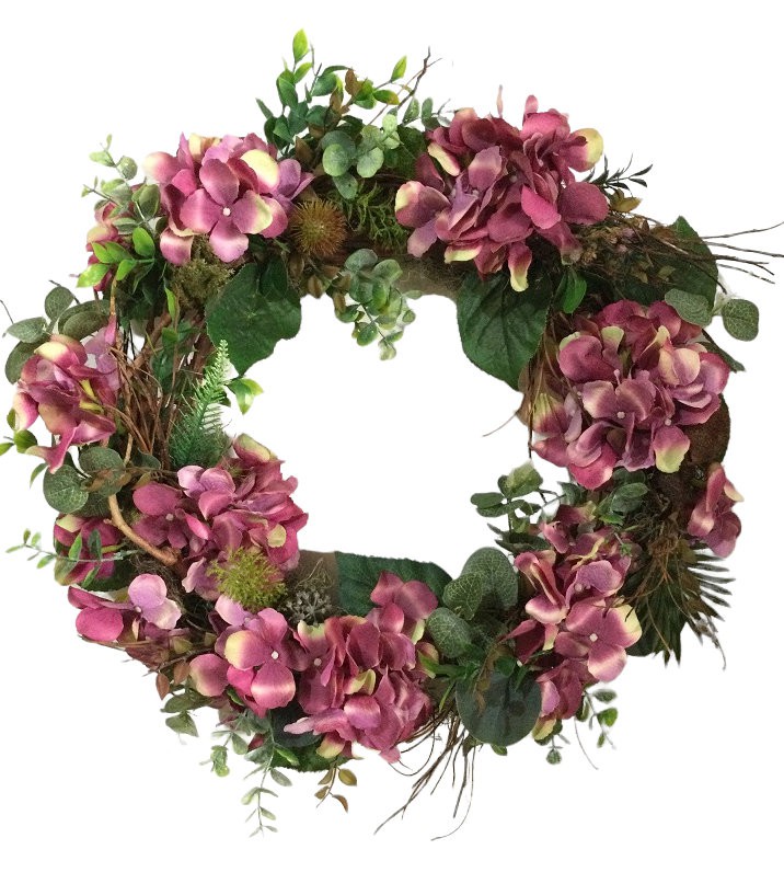 Guirlanda de cipó com hortênsias cor de rosa e folhagens. Usada o ano inteiro em portas de entrada ou varandas.
