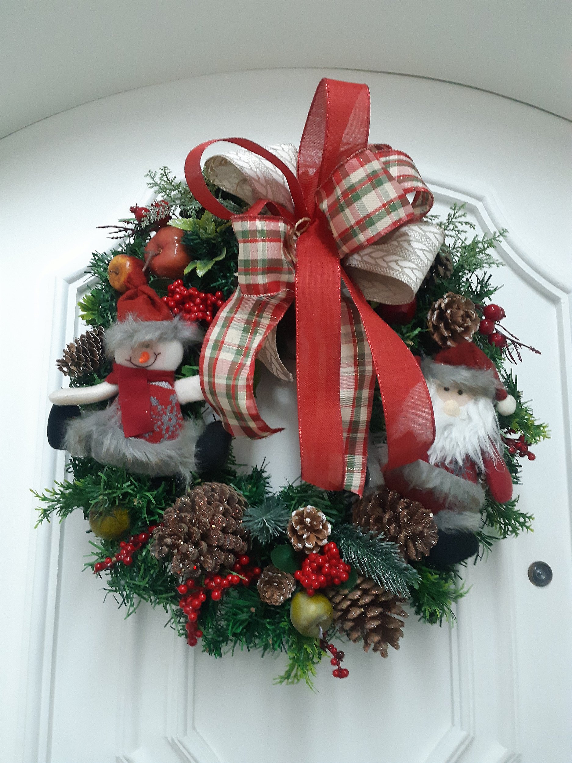 Guirlanda natalina com frutinhas, folhagens, bonequinhos, pinhas e laço.