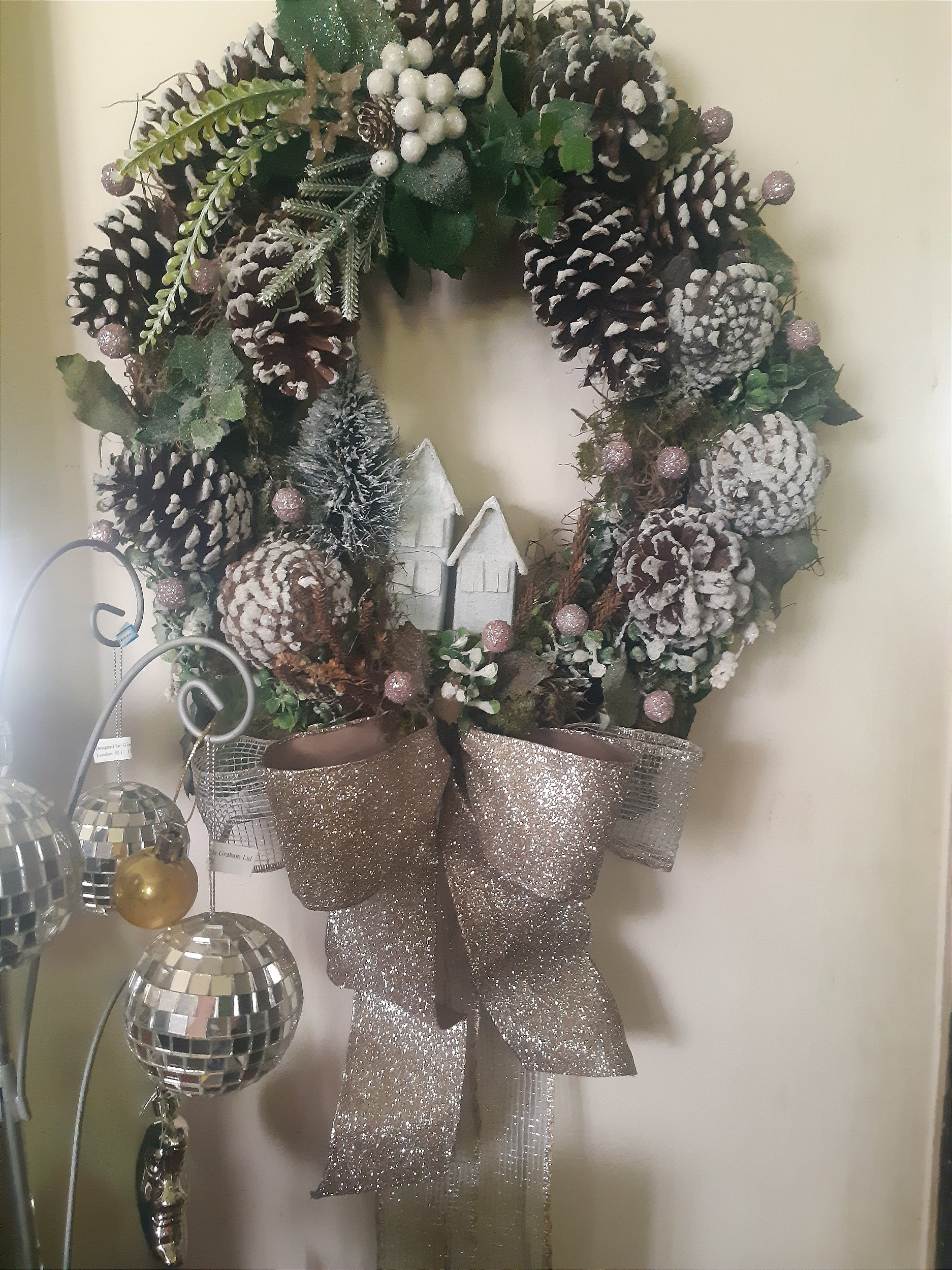 Guirlanda de cipó buriti, com pinhas, casinhas, mini árvore, berries brancos, laços e folhagens.