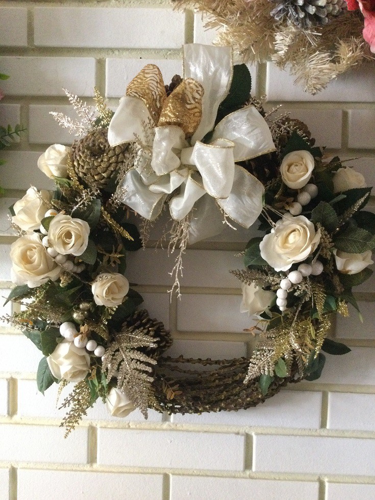 Guirlanda natalina de cipó com flores brancas, fitas brancas e complementos